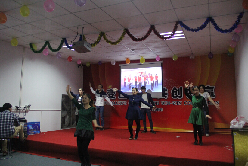 晚會中精彩節(jié)目不斷綻放,特約嘉賓書法大師陳老師給我們剖析《西游記》精彩判斷,個個聽的聚精會神;帥哥們的演唱呼聲一片一片的;美女帥哥們精心準(zhǔn)備的舞蹈拉動著大家的熱情;一個《賣蘋果》小品將大家的熱情帶到了高潮,笑聲、掌聲不斷;游戲環(huán)節(jié)生產(chǎn)和辦公室進(jìn)行了互動,同志們的熱情不減;國際友人過年,當(dāng)然是少不了我們外貿(mào)部的同事獻(xiàn)上的英文歌曲......