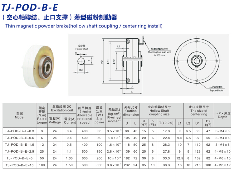 下圖就是關于超薄型空心磁粉制動器剎車器選型參數: