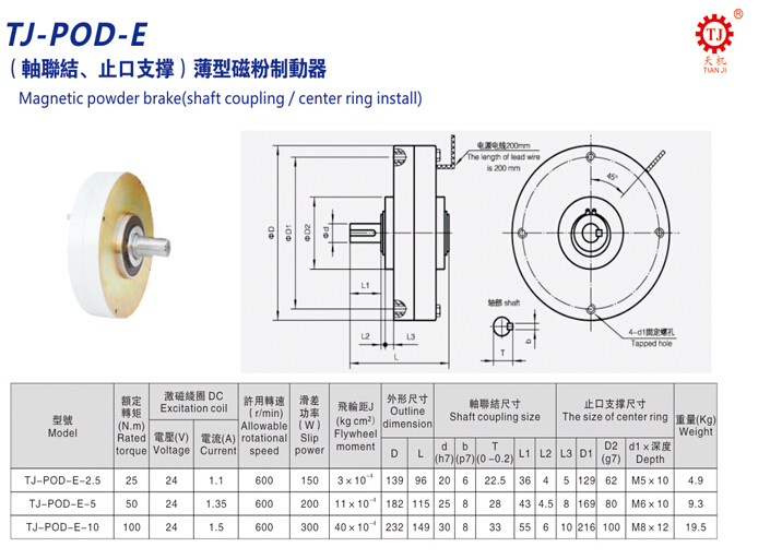 TJ-POD-E型(軸聯(lián)結(jié)、止口支撐)超薄型磁粉剎車(chē)器