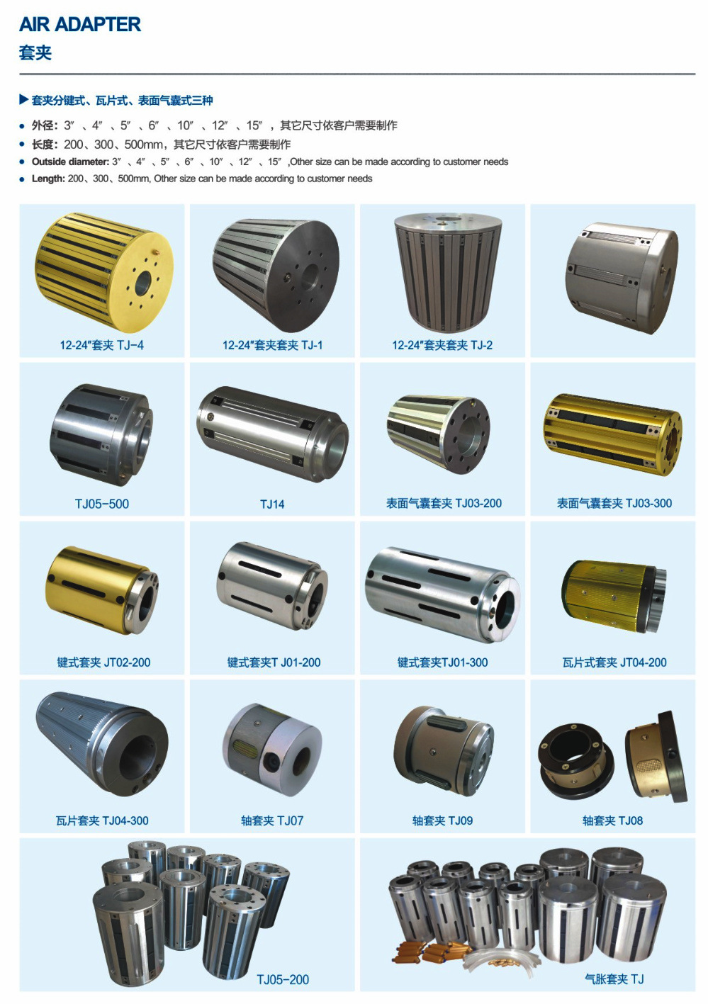 鋁合金板條式氣脹套夾,鋼制瓦片式氣脹套夾技術參數:氣漲套主體外徑Φ150mm,動作外徑Φ155mm,適用紙管Φ149-153mm、201-205mm、252-256mm、302-305mm主體長度200mm,250mm,300mm,400mm,500mm等。